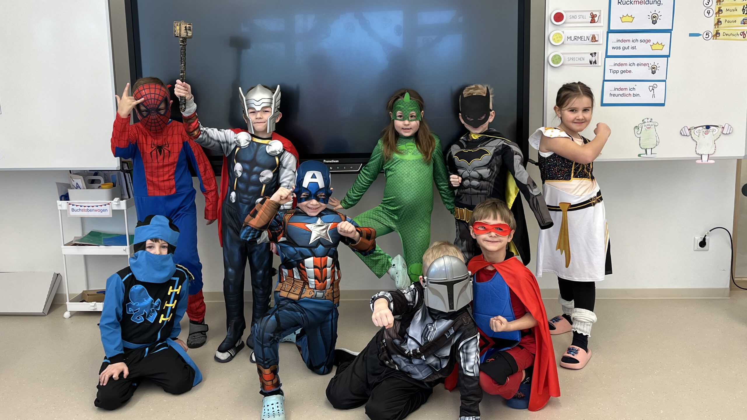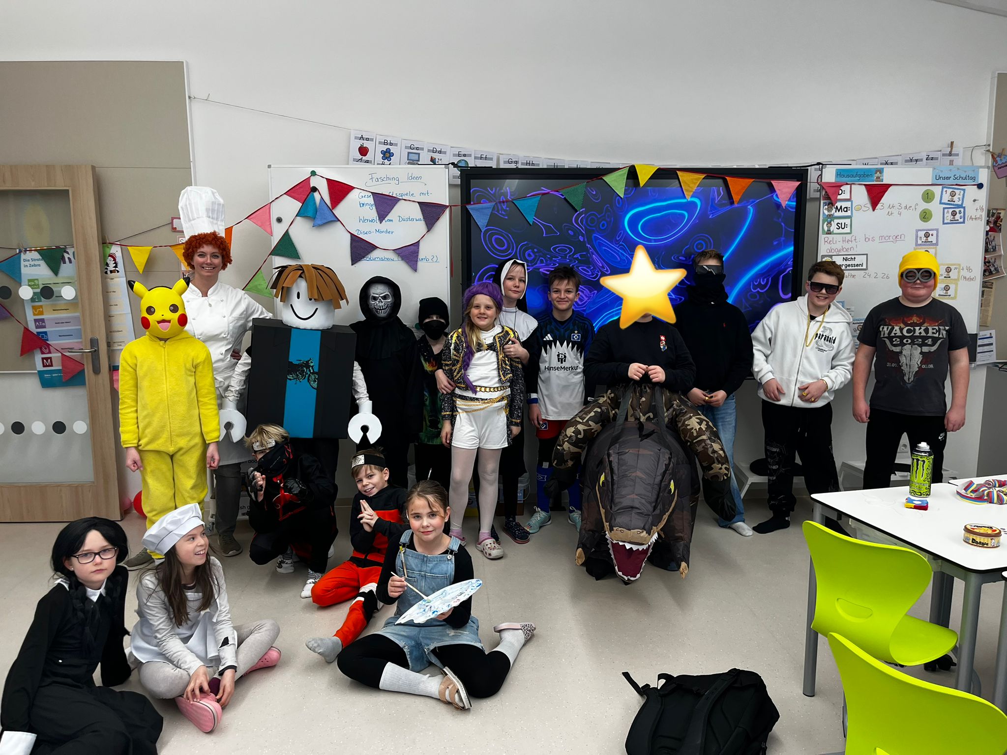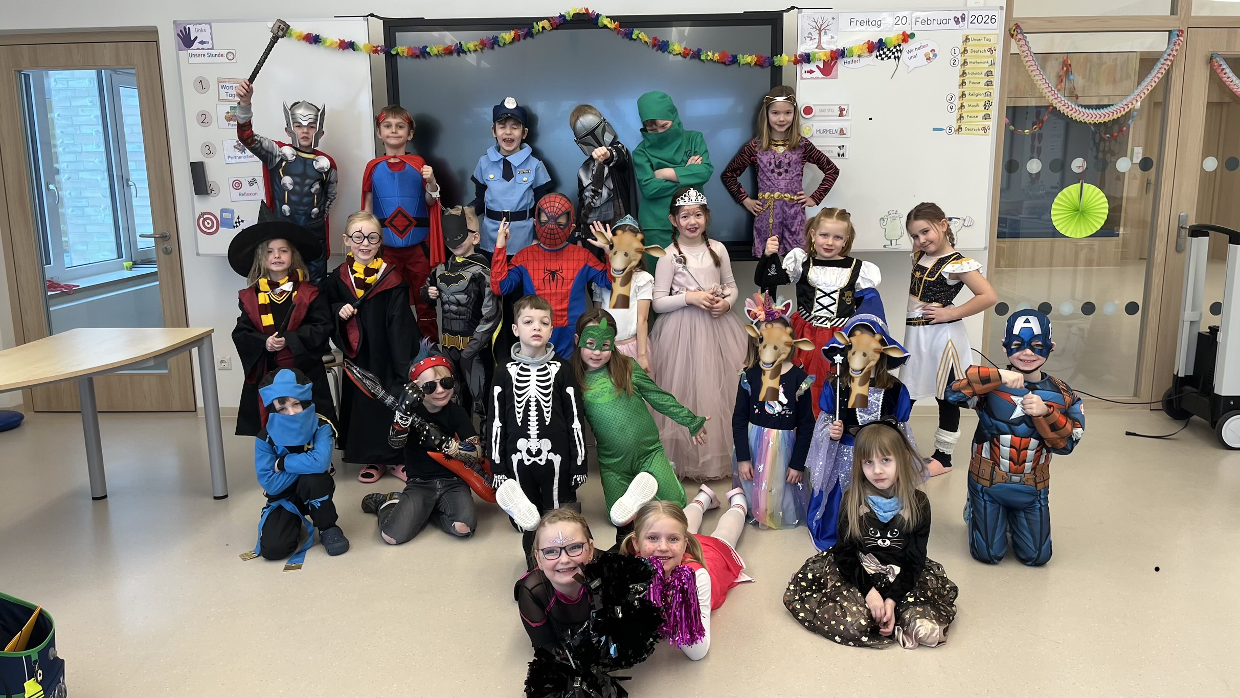 Am 20.2.26 haben wir bei uns in der Schule Fasching gefeiert. Überall auf den Fluren begegnete man Prinzessinnen, Superhelden, Tieren und vielen anderen fantasievollen Gestalten. Der Tag begann mit einem leckeren Frühstücksbuffet in den Klassen. Gemeinsam wurde geschlemmt, gelacht und die tollen Kostüme bestaunt. Anschließend wurde in den Klassen gespielt , getanzt und gefeiert. Bei lustigen Spielen war Teamgeist gefragt und es wurde viel gelacht. Die fröhliche Stimmung war in jedem Klassenzimmer zu spüren. Ein besonderes Highlight in diesem Jahr war der Klassenwettbewerb „Schönstes Kostüm“. Danach trafen sich alle Klassen in der Aula zur großen Faschingsparty. Gemeinsam wurden Partytänze getanzt und zum Abschluss gab es eine große Polonaise durch die ganze Schule.