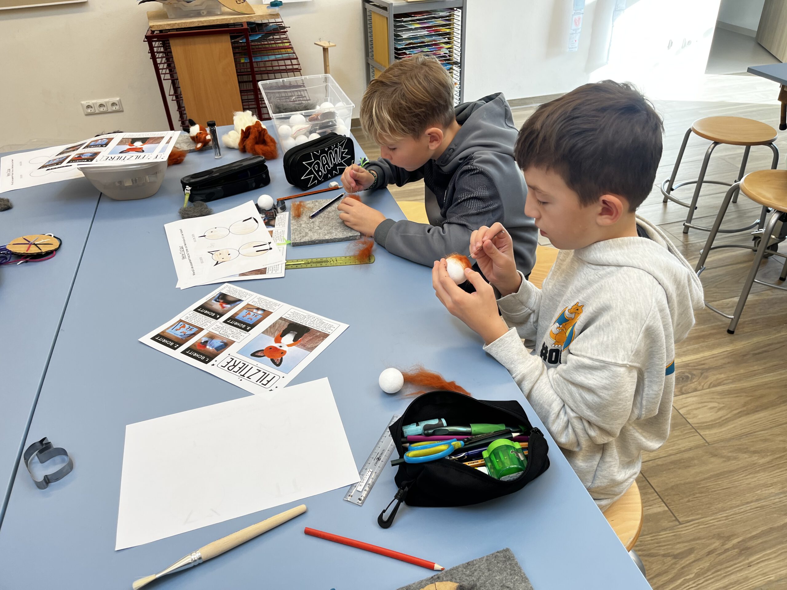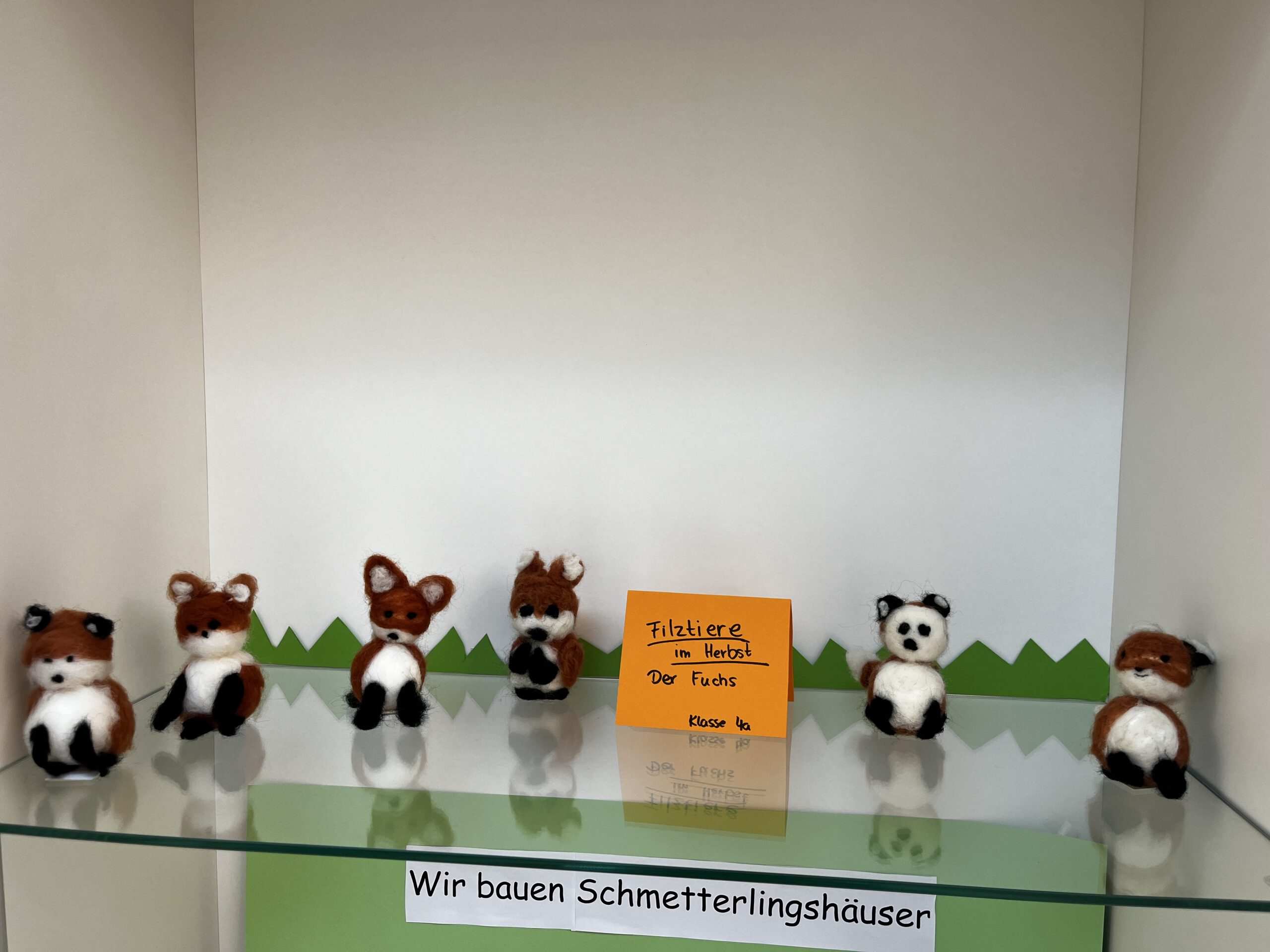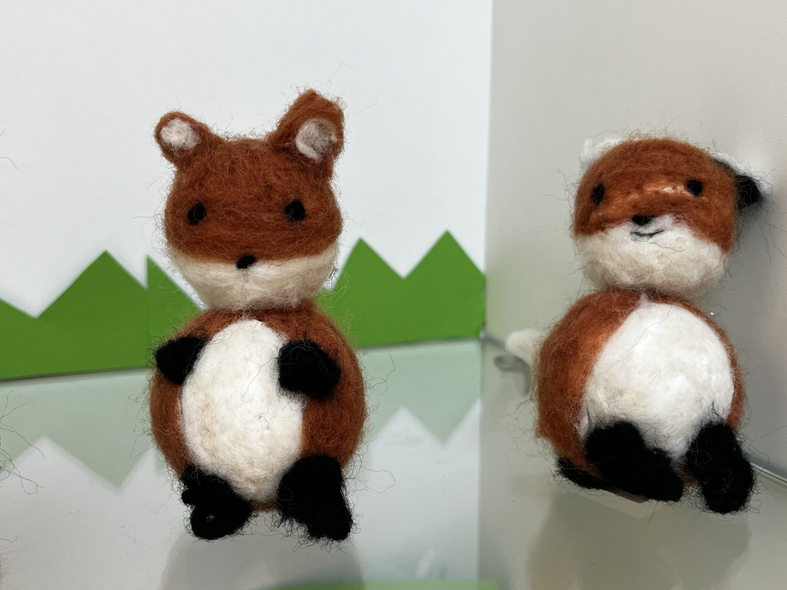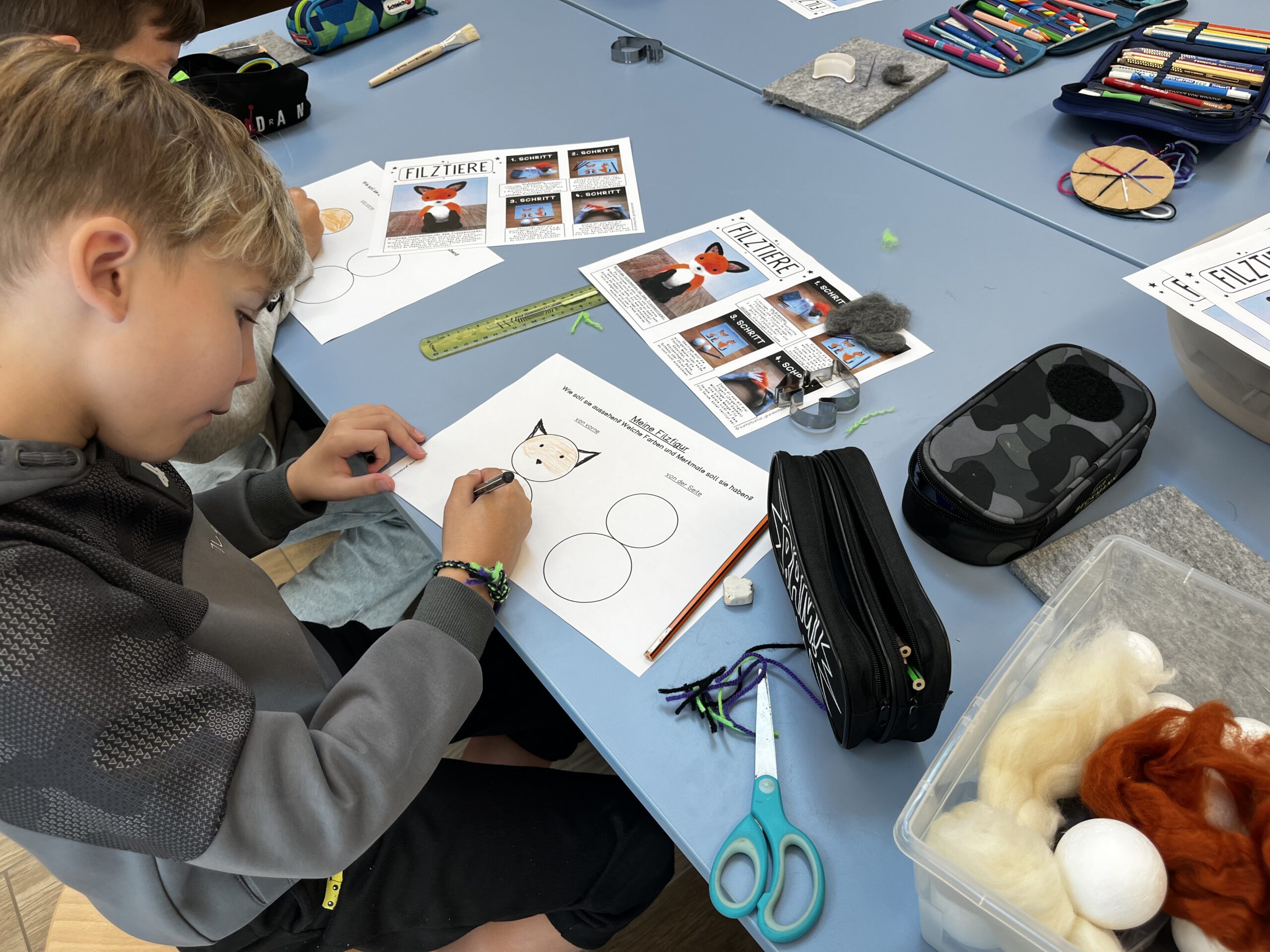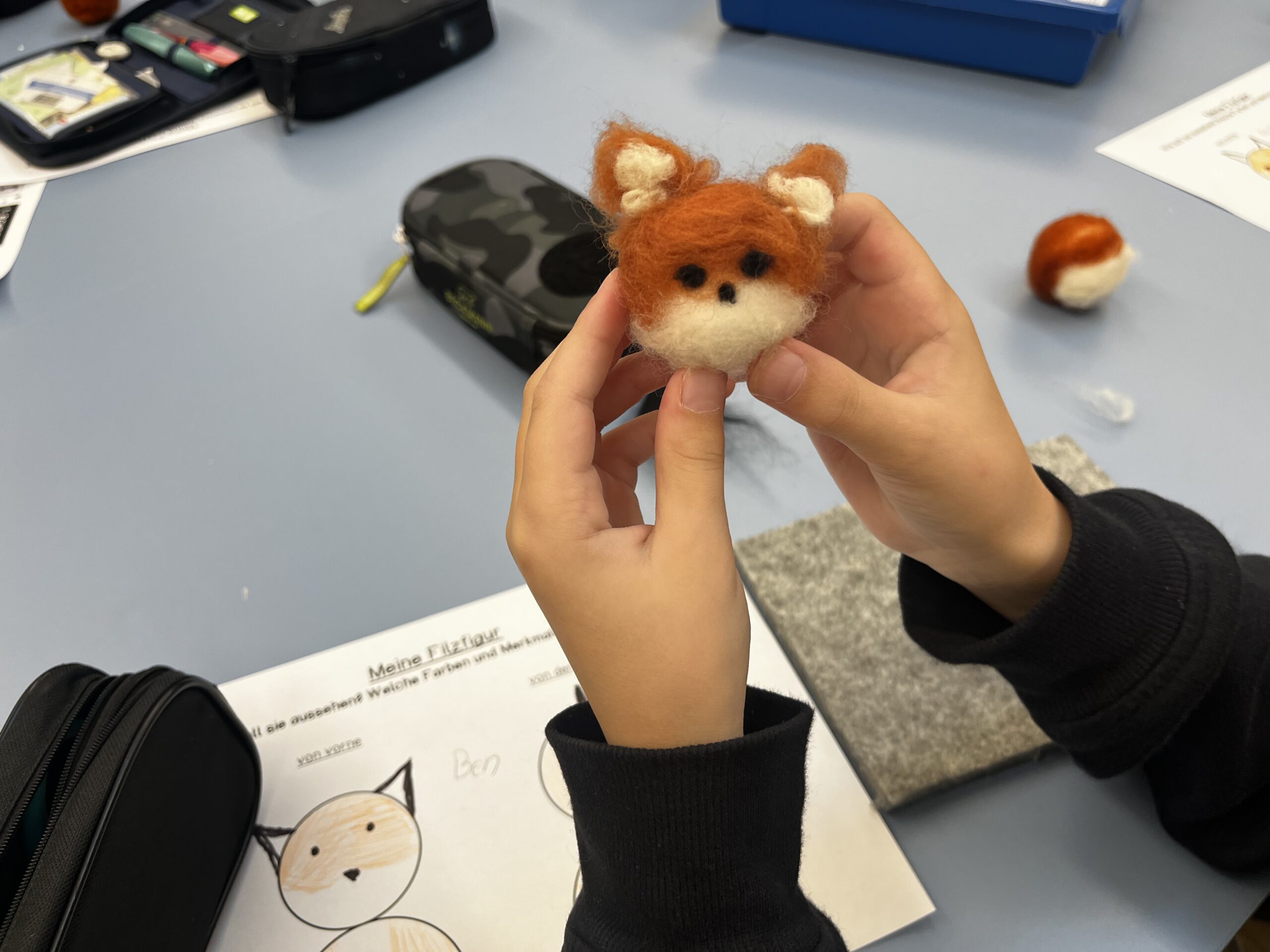 Die Klasse 4a hat im Kunstunterricht das Trockenfilzen kennengelernt. Ziel war es am Ende einen niedlichen Fuchs zu filzen. Dafür haben die Kinder zunächst mit Backförmchen Filz kennengelernt und erste Übungen gemacht, den Filz in Form zu bringen. Anschließend wurden die Entwürfe für die Füchse gezeichnet. Nun ging es ans Filzen. Mit einer Filznadel wurden Kopf und Körper sowie Ohren und Schwanz gefilzt. Am Ende wurde alles zusammengesetzt. Fertig waren die Füchse!