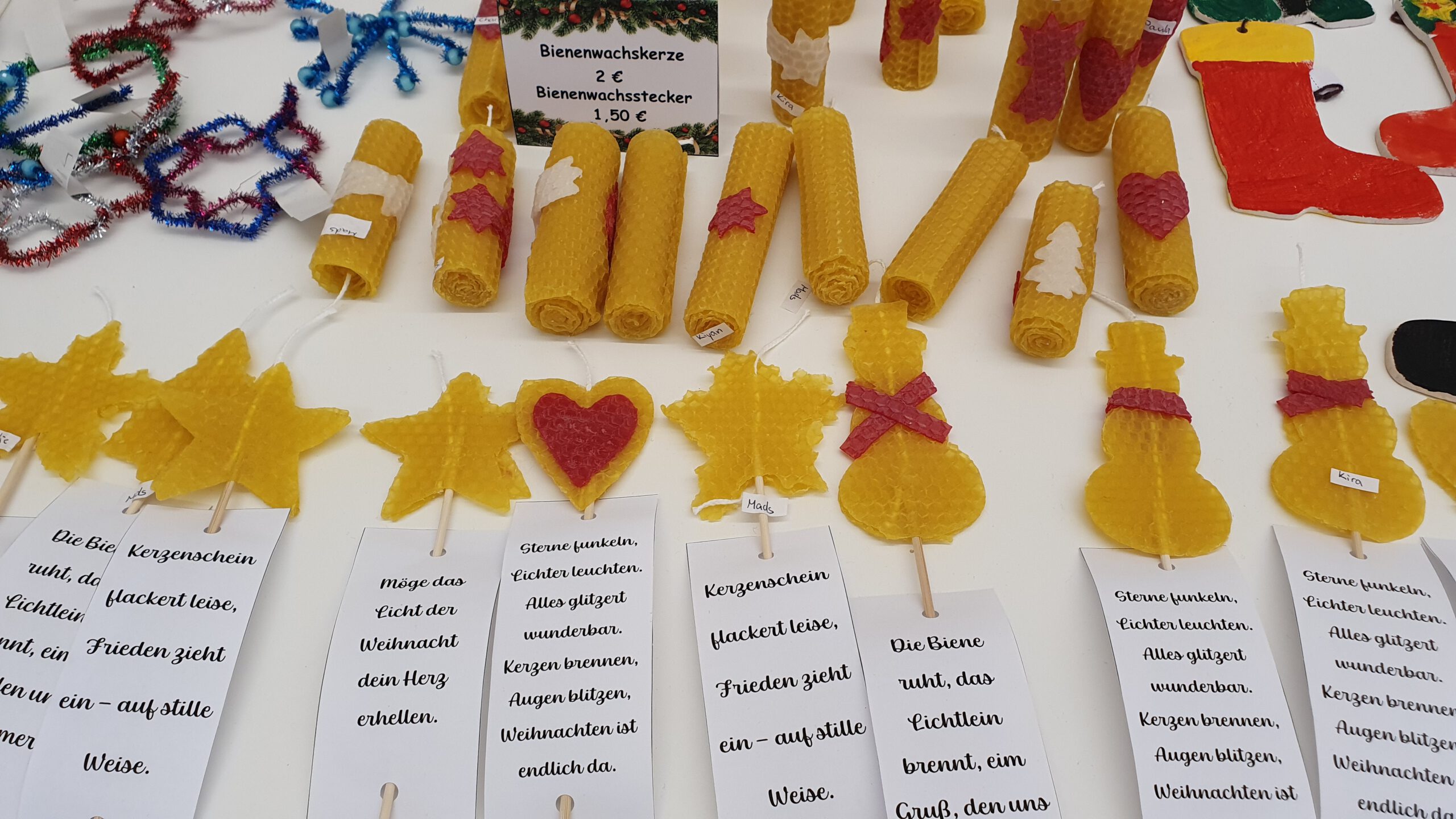 Mit viel Kreativität hatten Eltern wunderschöne Adventskränze, Gestecke und andere winterliche Bastelarbeiten hergestellt. Auch unserer Schülerinnen und Schüler waren fleißig. In allen Klassen wurde in den Wochen zuvor gebastelt und gewerkelt. Die selbst gestalteten Weihnachtsgeschenke fanden großen Anklang und waren schnell vergriffen. Für das leibliche Wohl war ebenfalls gesorgt. Es gab Waffeln, Bratwurst, Weihnachtspunsch und knuspriges Popcorn. Ein besonderes Highlight war auch in diesem Jahr wieder die Tombola des Fördervereins, bei der zahlreiche Preise gewonnen werden konnten.